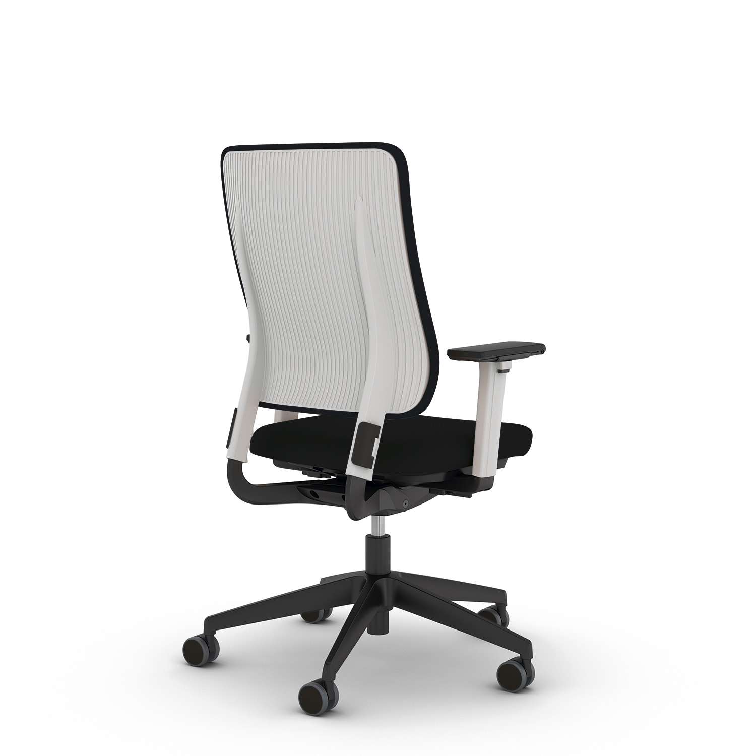 Sitz schwarz bezogen; Netzbespannung der Rückenlehne in blau oder schwarz verfügbar.